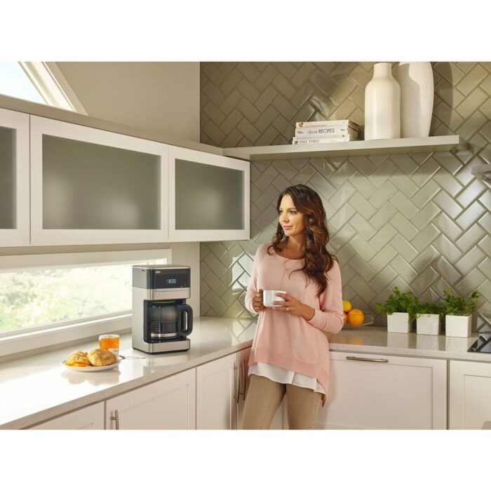 This coffee maker’s sleek design, large display and two-tone stainless steel/black finish make it the perfect finishing touch to your kitchen. Savor a world of flavor and aroma with Braun’s BrewSense drip coffee makers.