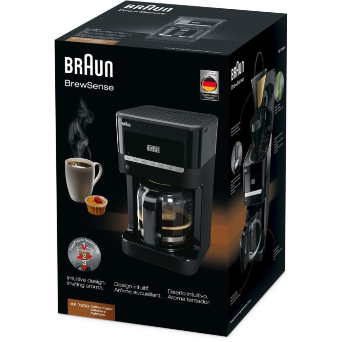Exceptional flavor is about nuance and balance. Braun’s BrewSense drip coffee maker, model KF7150BK, blends the two for rich, reliable coffee at home. Each satisfying coffee experience begins with expert brewing knowledge, thoughtful design, and Braun’s unique PureFlavor system that brings out the essence and complexity of each coffee bean.