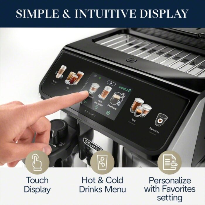 The LatteCrema Hot System textures milk or your favorite milk alternatives to perfection for your favorite classic espresso beverages like lattes and cappuccino. The LatteCrema Cool System delivers velvety milk cold foam at the ideal temperature for cold drinks. Enjoy cold brew coffee in under 3 minutes with De’Longhi’s Cold Extraction Technology. This proprietary technology utilizes precisely measured water flow and pressure rates, along with specific extraction temperatures, to create a delicious cold brew coffee in less than 3 minutes. Clean-up is simple thanks to our auto-clean function and detachable, dishwasher-safe design. The full-touch display and soft touch control icons allow you to navigate easily and craft your favorite espresso beverages with ease. With the Eletta